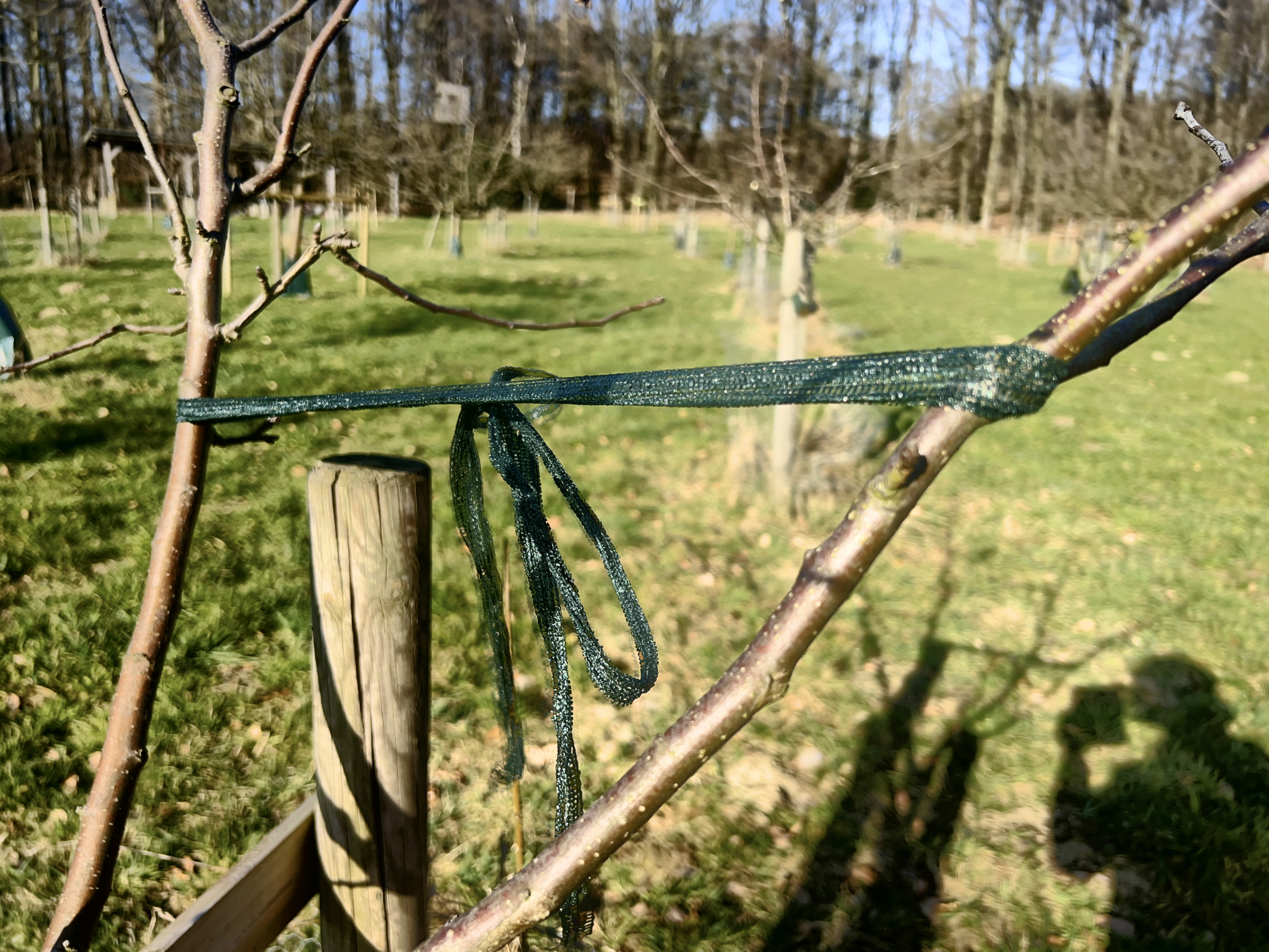 Gibt es Möglichkeiten, solche unerwünschten Effekte vermeiden? Ja, dadurch, dass die Schlaufe doppelt um den jungen Ast geschwungen und auch dort mit einer Schleife befestigt wird. Das hält das Band in Position, so dass es nicht mehr abrutschen kann. Einige Monate später stellt man dann aber verwundet fest, dass es zu massiven Einschnürungen gekommen ist, weil der Ast dicker geworden ist.