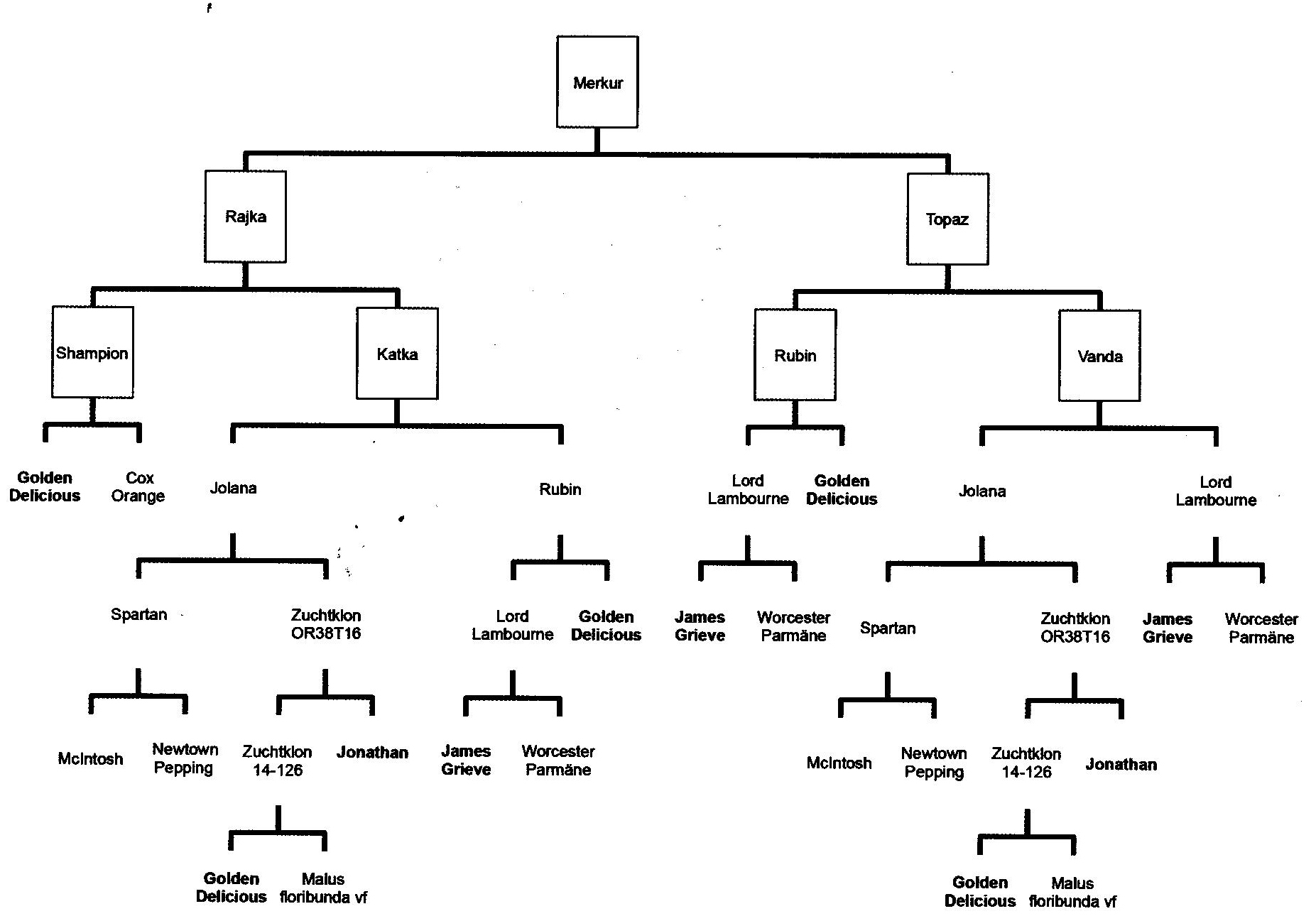 - Topaz (CZ 1994) = Rubin [Golden Delicious x Lord Lambourne (James Grieve x Worcester Parmäne)] x Vanda [Jolana (Zuchtklon u.a. aus Golden Delicious u. Malus floribunda) x Lord Lambourne (James Grieve x Worcester Parmäne)]