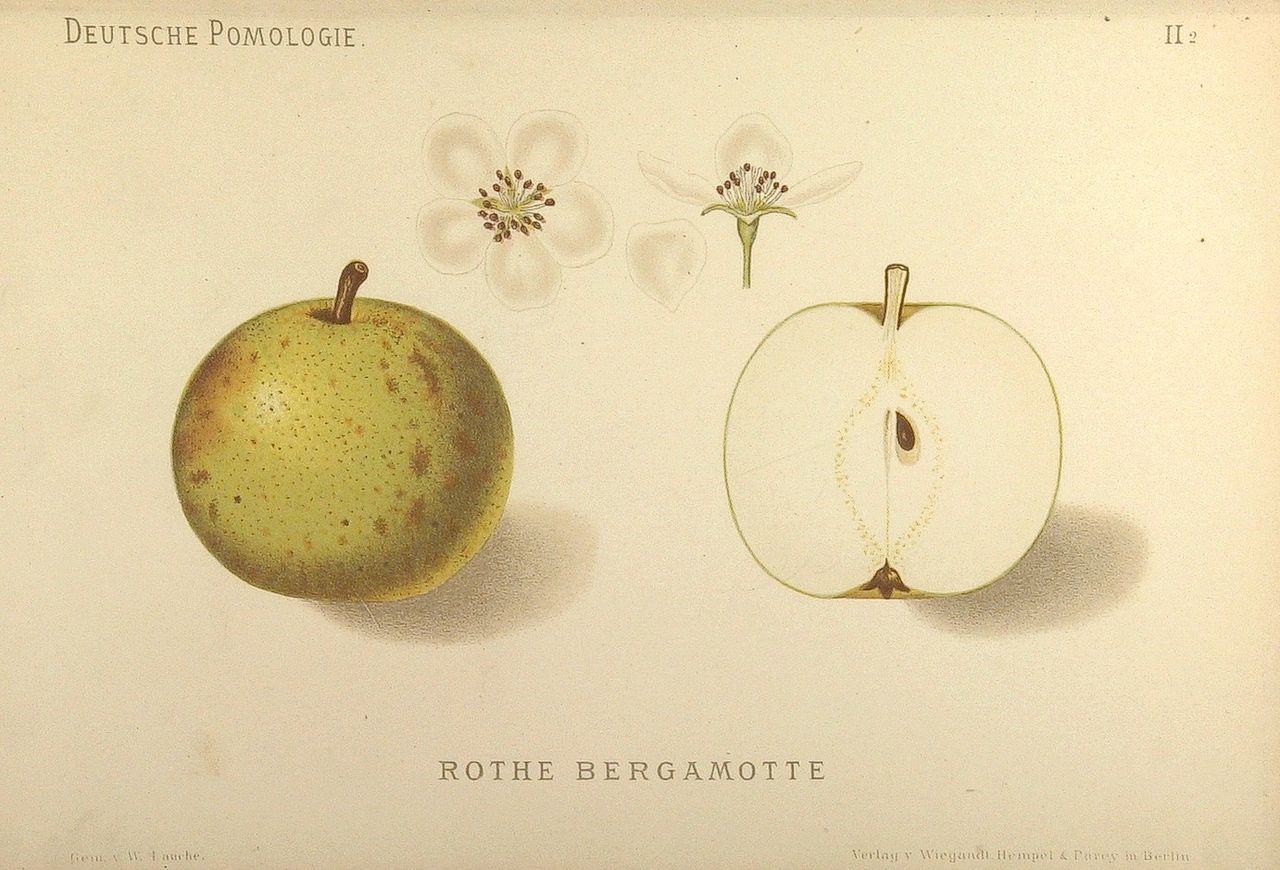Die Rote Bergamotte ist eine sehr alte, robuste und selten gewordene Birnensorte, die schon 1588 erste Erwähnung fand. Verträgt auch trockenere Böden und ist widerstandsfähig gegenüber Erkrankungen. Früh einsetzender, regelmäßiger Ertrag. Früchte rundlich, relativ klein und voll ausgereift von rötlich-brauner Farbe. Fruchtfleisch häufig rötlich durchzogen.
